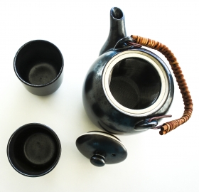 Un conjunto de tetera japonesa exquisita, que incluye una jarra de té negro elegante, y dos tazas de té. Esta es la forma más completa que uno puede tener para relajarse y disfrutar de té con amigos, familiares, seres queridos o para usted mismo. Hecha de cerámica pura, este conjunto es de cristal con acabado medio brillo, con un asa de bambú, y viene con un extraíble infusionador de acero inoxidable. Hecha en Japón sin plomo.La tetera tiene 28 oz de líquido; copas tienen 4 oz de líquido cada una.